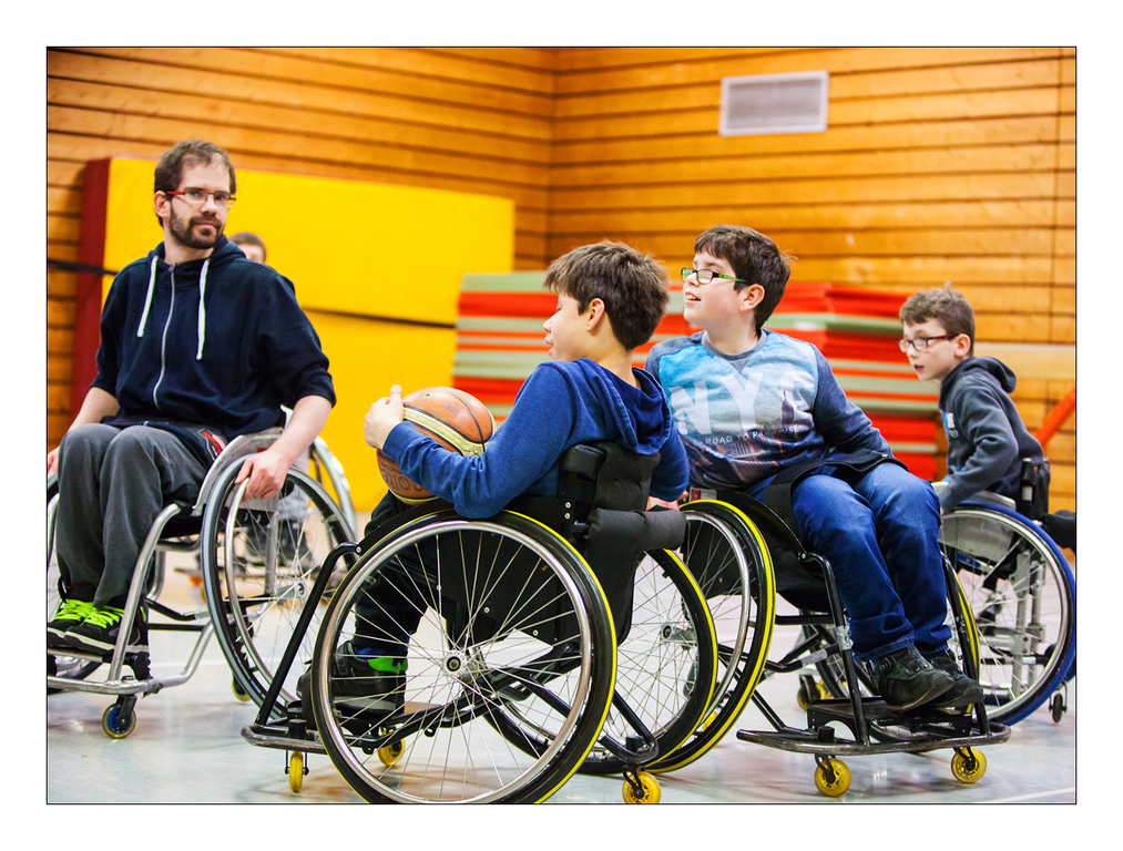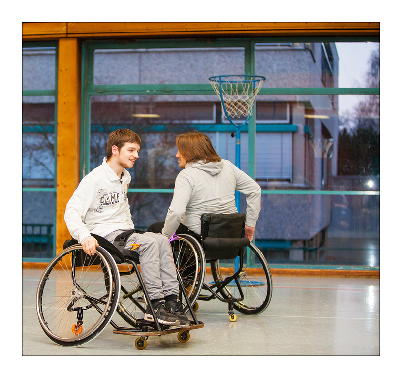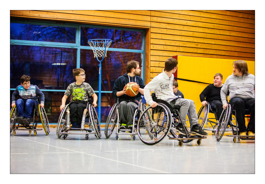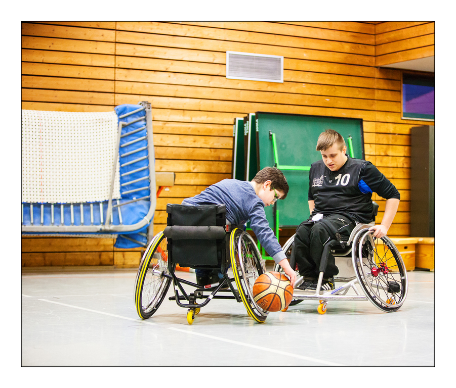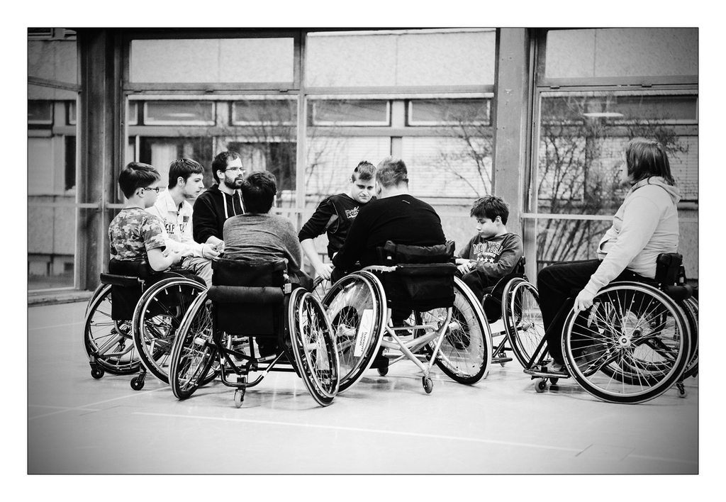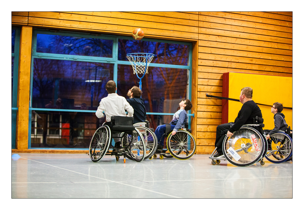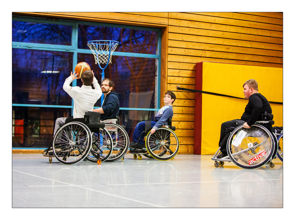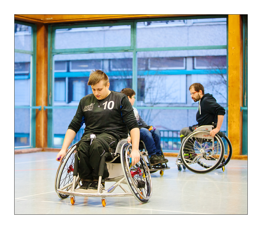 Nachdem allen Teilnehmern ein passendes Sportgerät in Form eines Sportrollstuhls zugewiesen wurde, gab es kein Halten mehr. Sofort wurde das neue Sportgerät ausgetestet und die ersten Körbe geworfen.