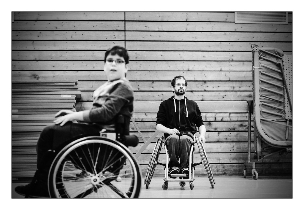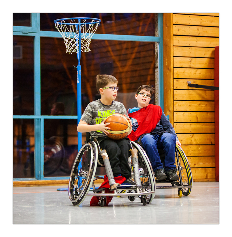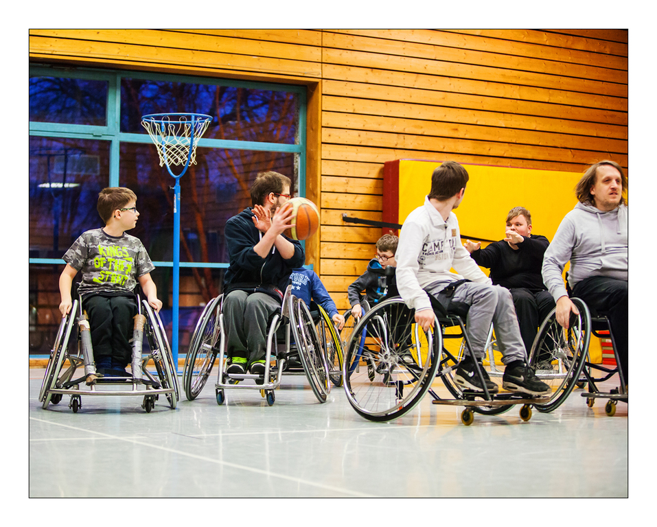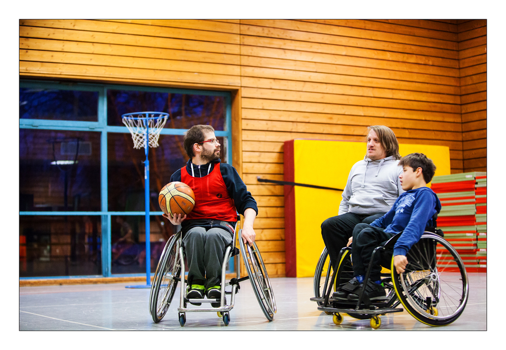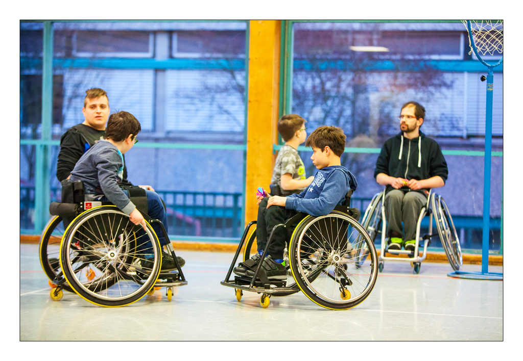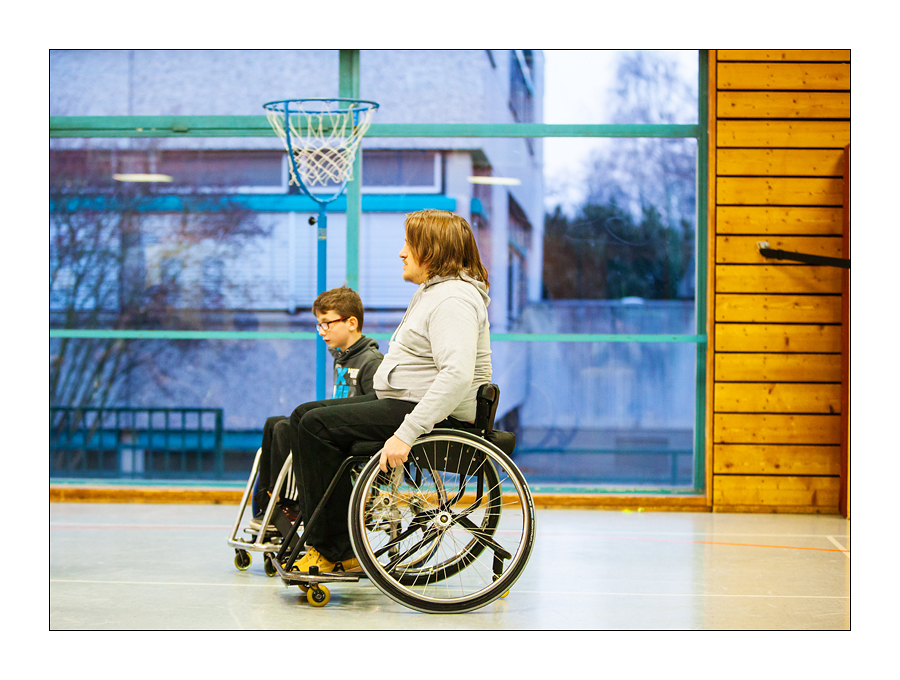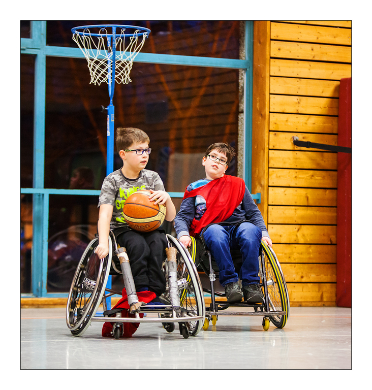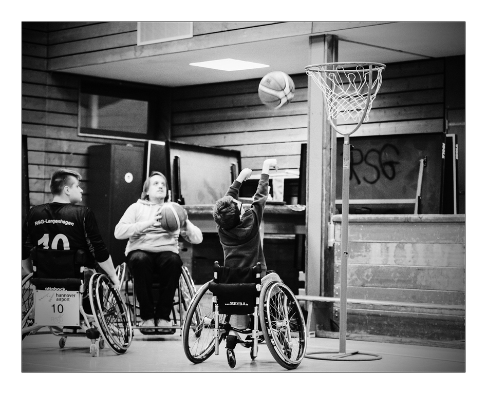 Nachdem allen Teilnehmern ein passendes Sportgerät in Form eines Sportrollstuhls zugewiesen wurde, gab es kein Halten mehr. Sofort wurde das neue Sportgerät ausgetestet und die ersten Körbe geworfen.